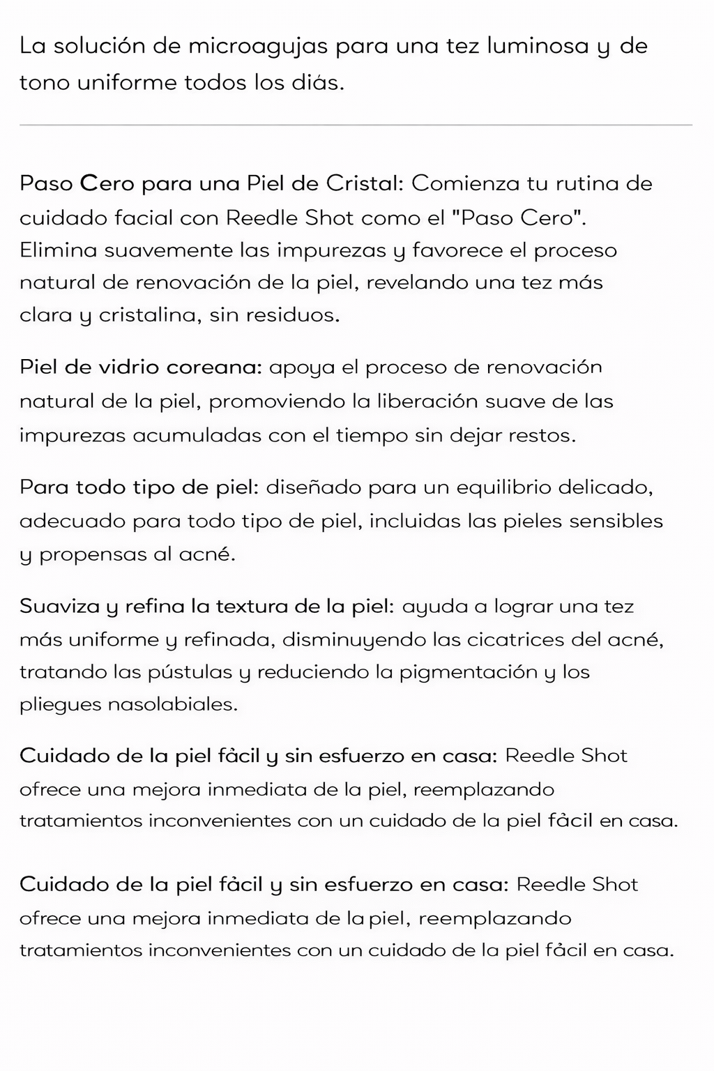 Este innovador booster facial utiliza micro-tecnología avanzada para mejorar visiblemente la textura, luminosidad y uniformidad de la piel desde las primeras aplicaciones.
